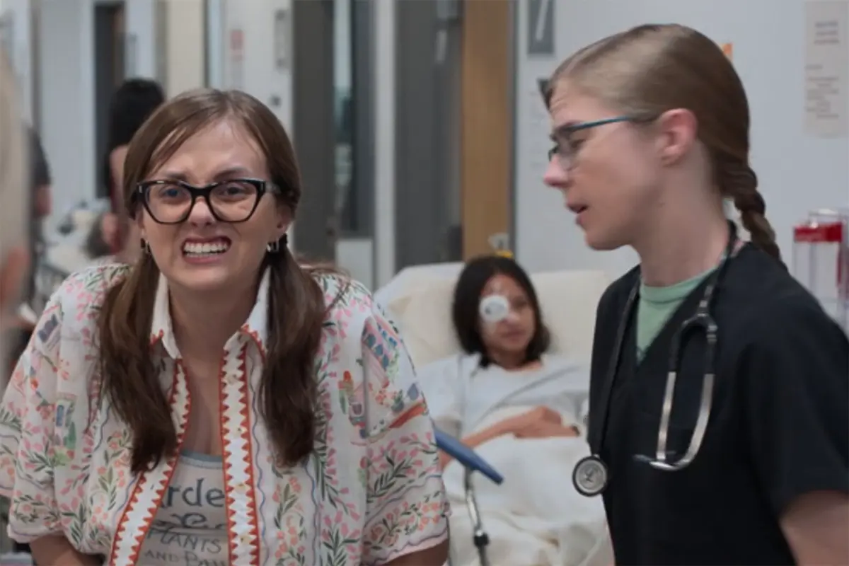 For Dr. Mel King, the realest part of this very long day has arrived. We know it’s been on her mind this whole season, but it’s now zero hour for the deposition in her malpractice case, and a stern hospital attorney has arrived to take her upstairs. It would freak anybody out. But Dr. King is particularly worried, which Robby recognizes and combats with more affirmations. And as if she wasn’t already consumed by overthinking on all the potential consequences – What if she lost her medical license? What if she could no longer support her autistic sister? – who drops into the ED from a very sweaty and crowded Chairs but Becca King (Tal Anderson) herself. Mel’s twin left her care facility because of a really bad bellyache, and is quite thrilled to meet in IRL so many of her sister’s colleagues. Dr. Langdon, for instance, who will treat her while Mel attends her deposition, has very nice hair. We can imagine the King sisters at home, with Mel explaining the characters in her hectic work life. (Which might be similar to “Dr. J.” and her work stories on TikTok.) When Becca meets the Pitt’s superhero charge nurse and co-senior attending, it’s like a celebrity red carpet event. “You’re Dr. Robby? Cool!”
