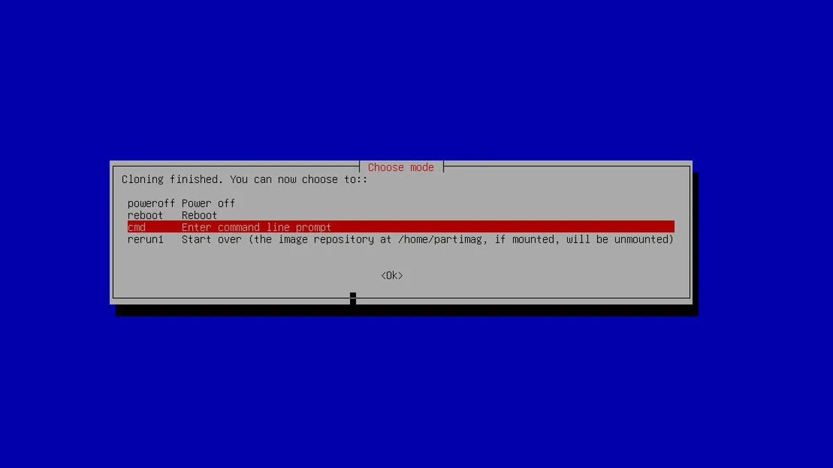 - What to do when done: Instruct Clonezilla on what to do when the imaging is finished. You can either select to enter the command prompt, reboot, or shut down.