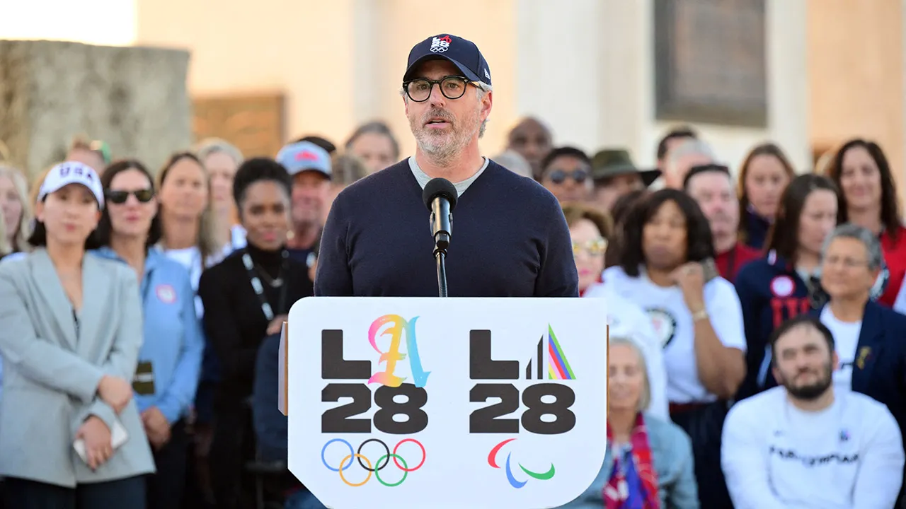Casey Wasserman, chairman of the LA2028 Olympics Organizing Committee, speaks during a ceremonial lighting of the LA28 Olympic cauldron at the Memorial Coliseum in Los Angeles Jan. 13, 2026, ahead of the launch of ticket registration for the 2028 Summer Olympic Games. (Frederic J. Brown/AFP via Getty Images)