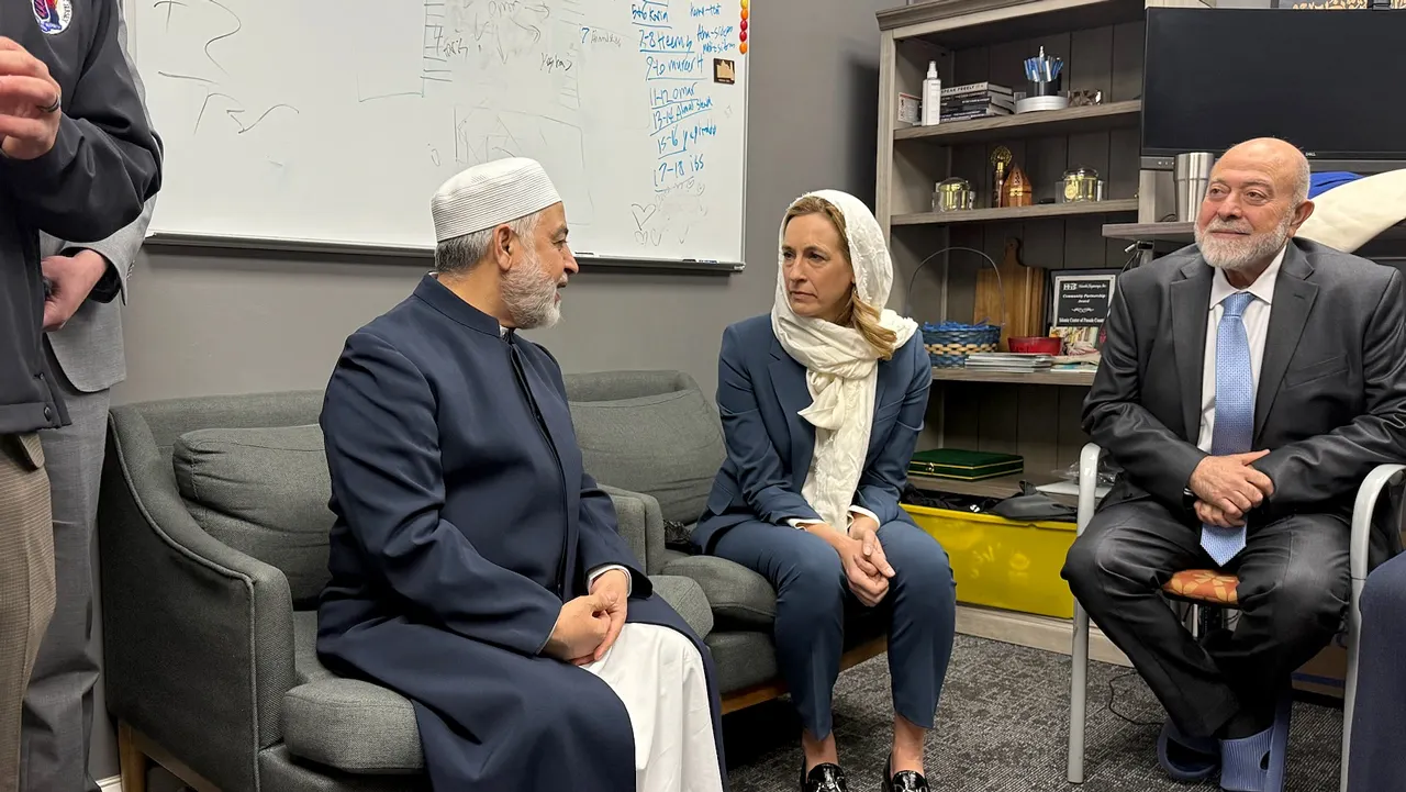 Sherrill posted photos of her visit to the Islamic Center of Passaic County on social media, wearing a hijab and taking selfies. In one image, she is seen speaking with the mosque’s longtime leader, Imam Mohammad Qatanani.