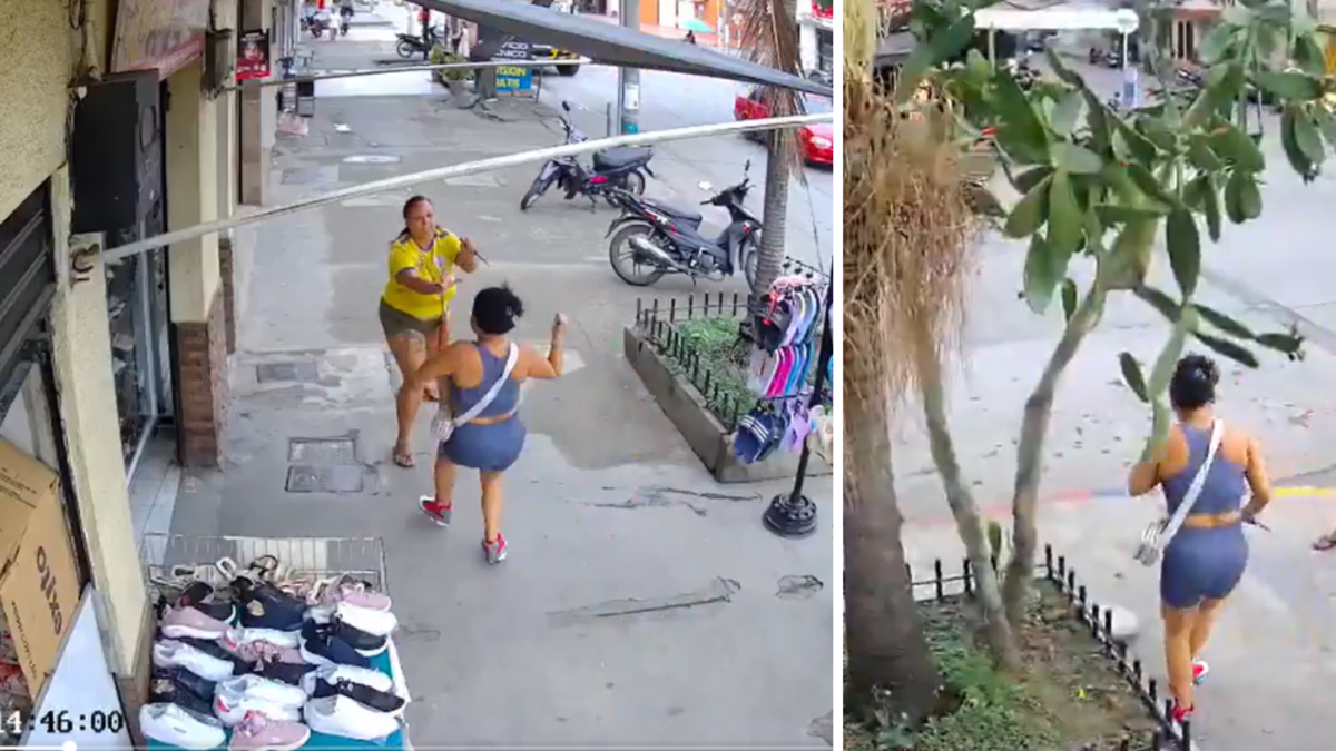 En el video de tres minutos registrado en cámaras de seguridad del sector, se observa como dos mujeres, una vestida de amarillo y otra de azul tienen una discusión acalorada.