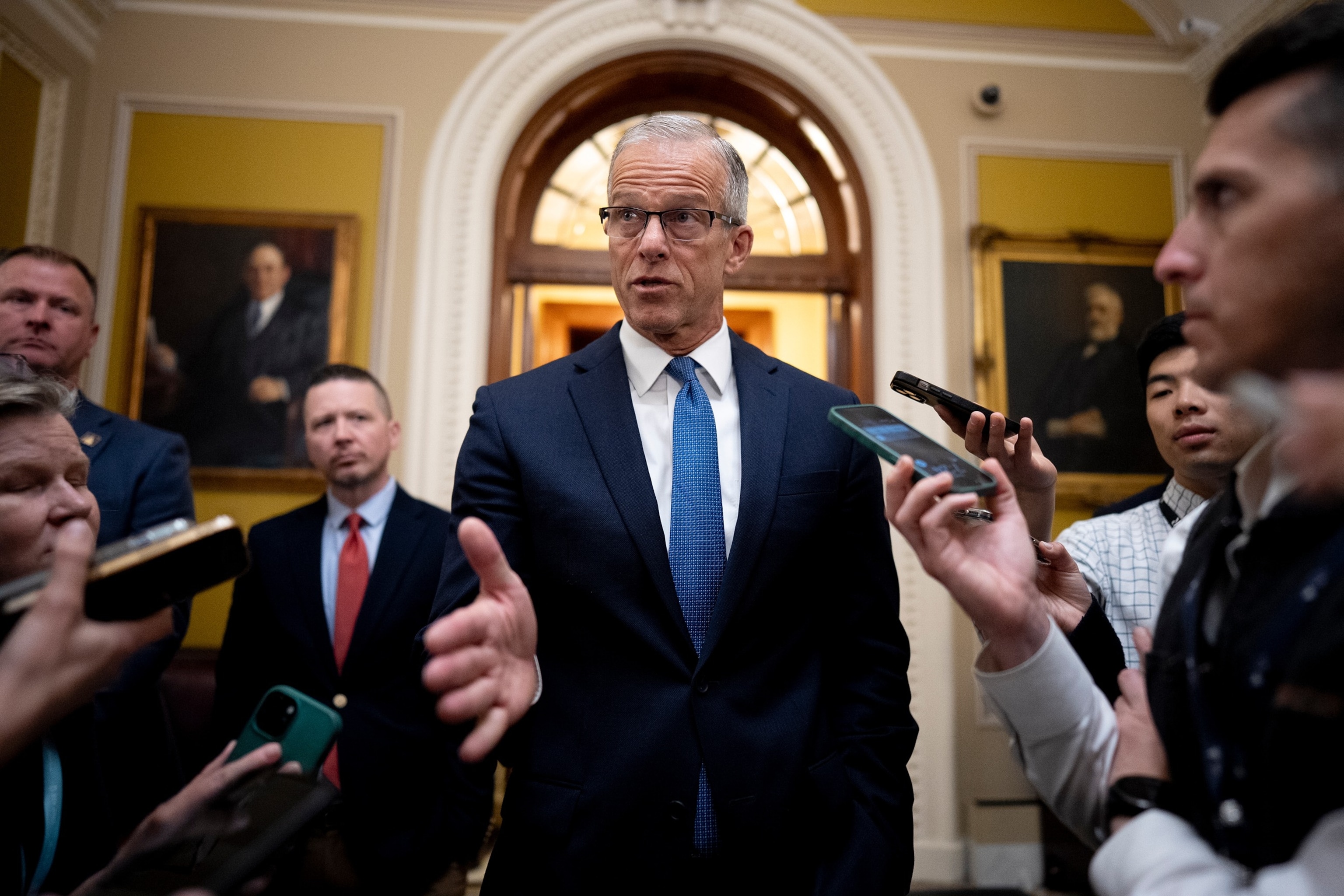 Senate Majority Leader John Thune speaks to member of the media outside the Senate Chamber after passing a Department of Homeland Security funding bill by unanimous consent at the U.S. Capitol, April 2, 2026 in Washington.
