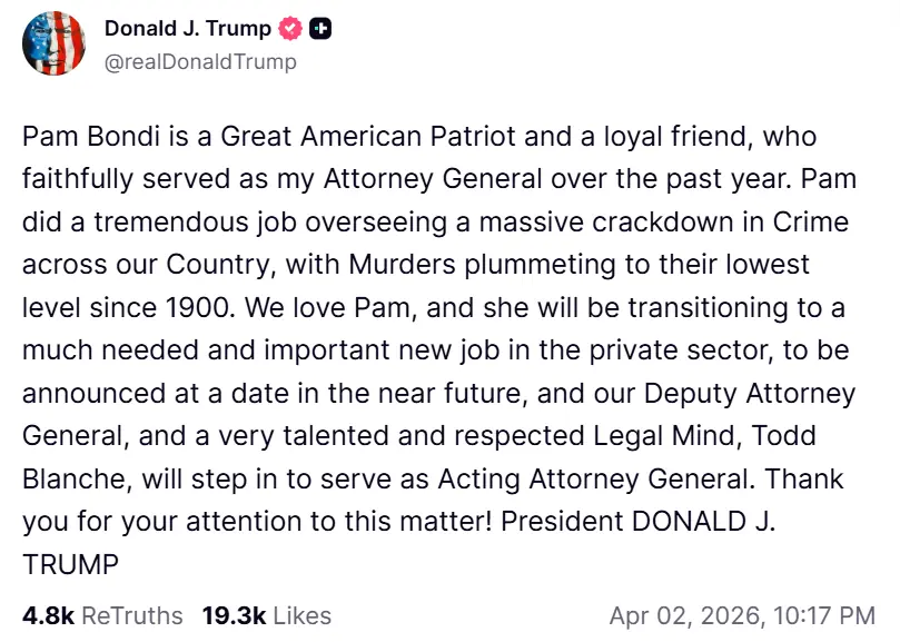 Bondi is the second senior Trump official to be ousted recently. Trump removed Homeland Security Secretary Kristi Noem on March 5 following criticism of her management of the agency and Trump’s immigration agenda.