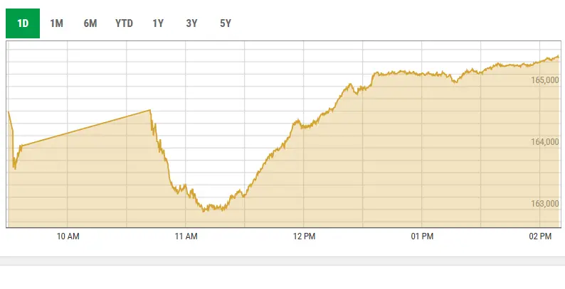 At 2:09pm, the market gained 13,794.14 points, or 9.09 per cent, from the previous close of 151,673.45 to stand at 165,467.59.
