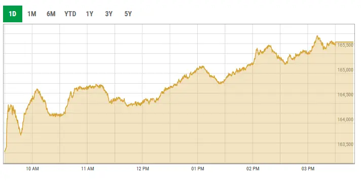 The index recorded an intraday low of 165,763.81 points at around 9:30am. However, it then rose to an intraday high of 165,763.81 points at around 3pm, before settling at 165,634.84.