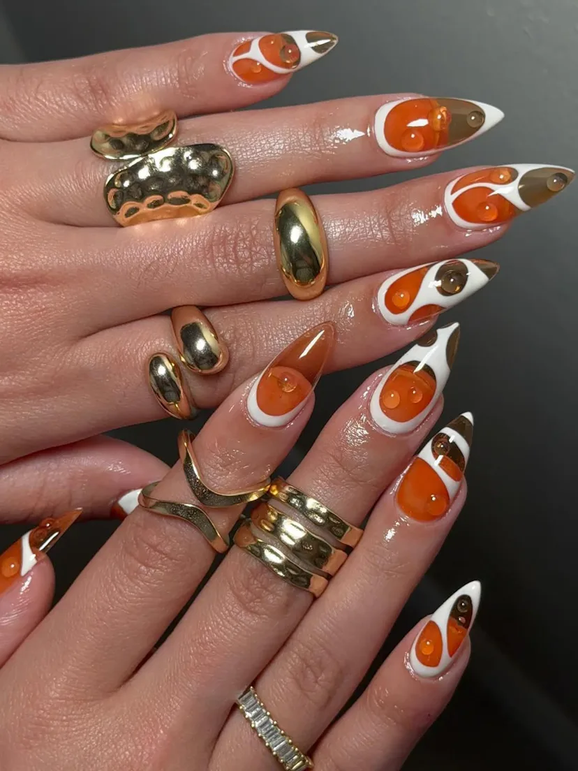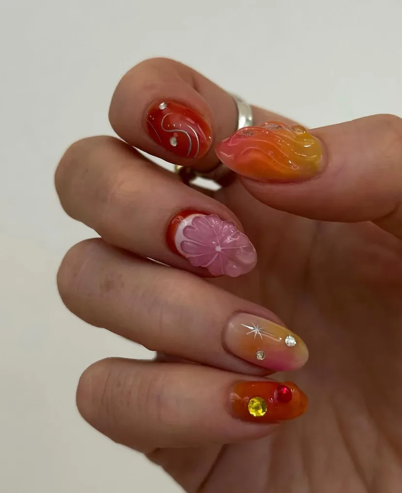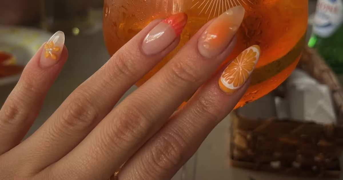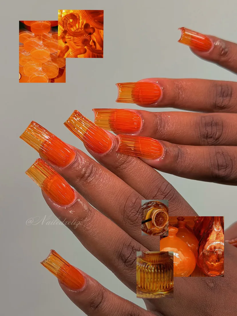 The color, though, is only half the story. What’s making the trend land is everything you can do with it, from ombré and cateye finishes that look like melted-down drinks to 3D droplets and shimmers that resemble the perfect amount of carbonation. Whether you keep the focus on the hot orange shade itself or layer on the details, it all feels very ready for a summer spent outside.