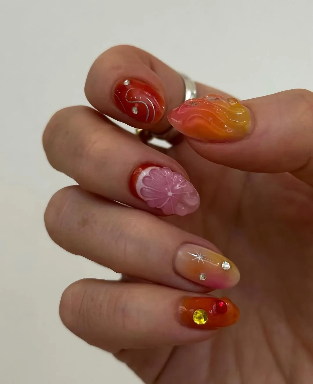 Some people go heavy on the Aperol, others keep it lighter and more Prosecco-forward — either way, this manicure covers the full spectrum, from bright red to citrusy orange.