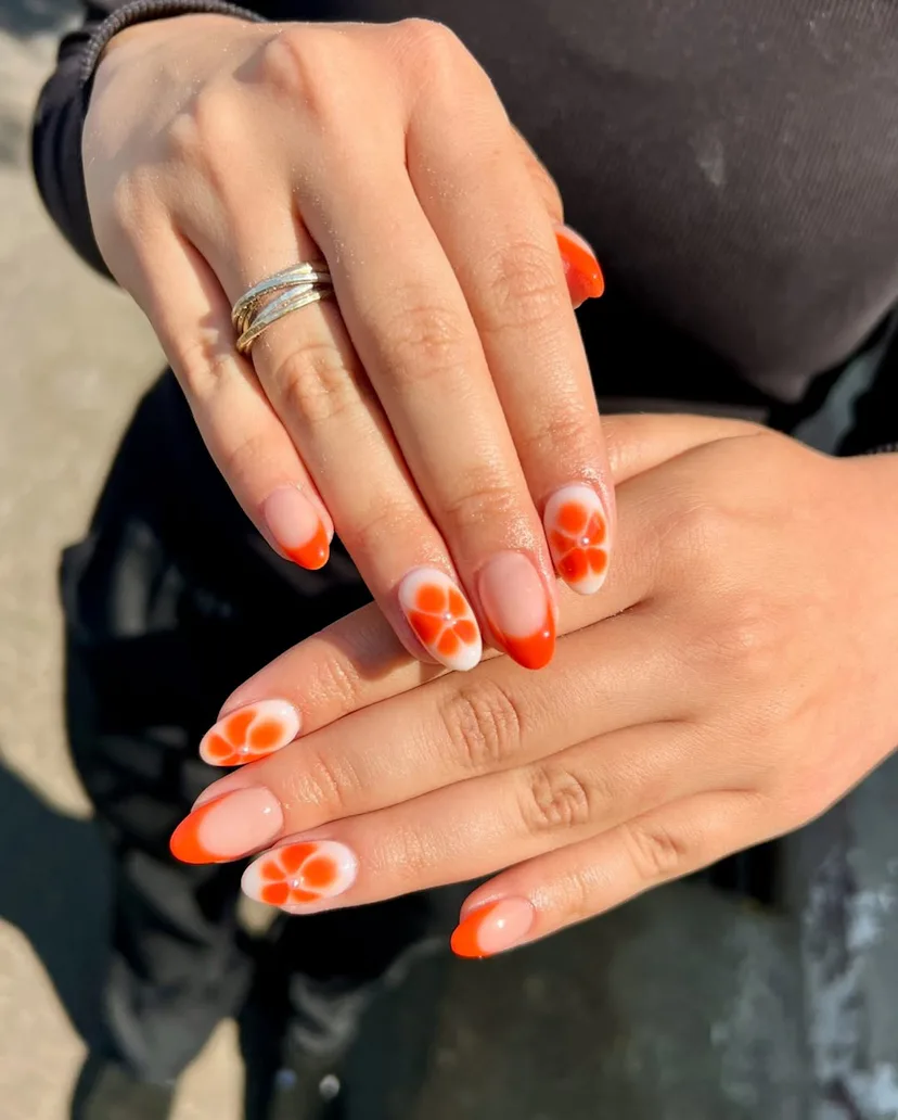 To upgrade your floral nail art, swap pastel polishes for a hot orange that feels fresh, bright, and actually kind of groundbreaking.