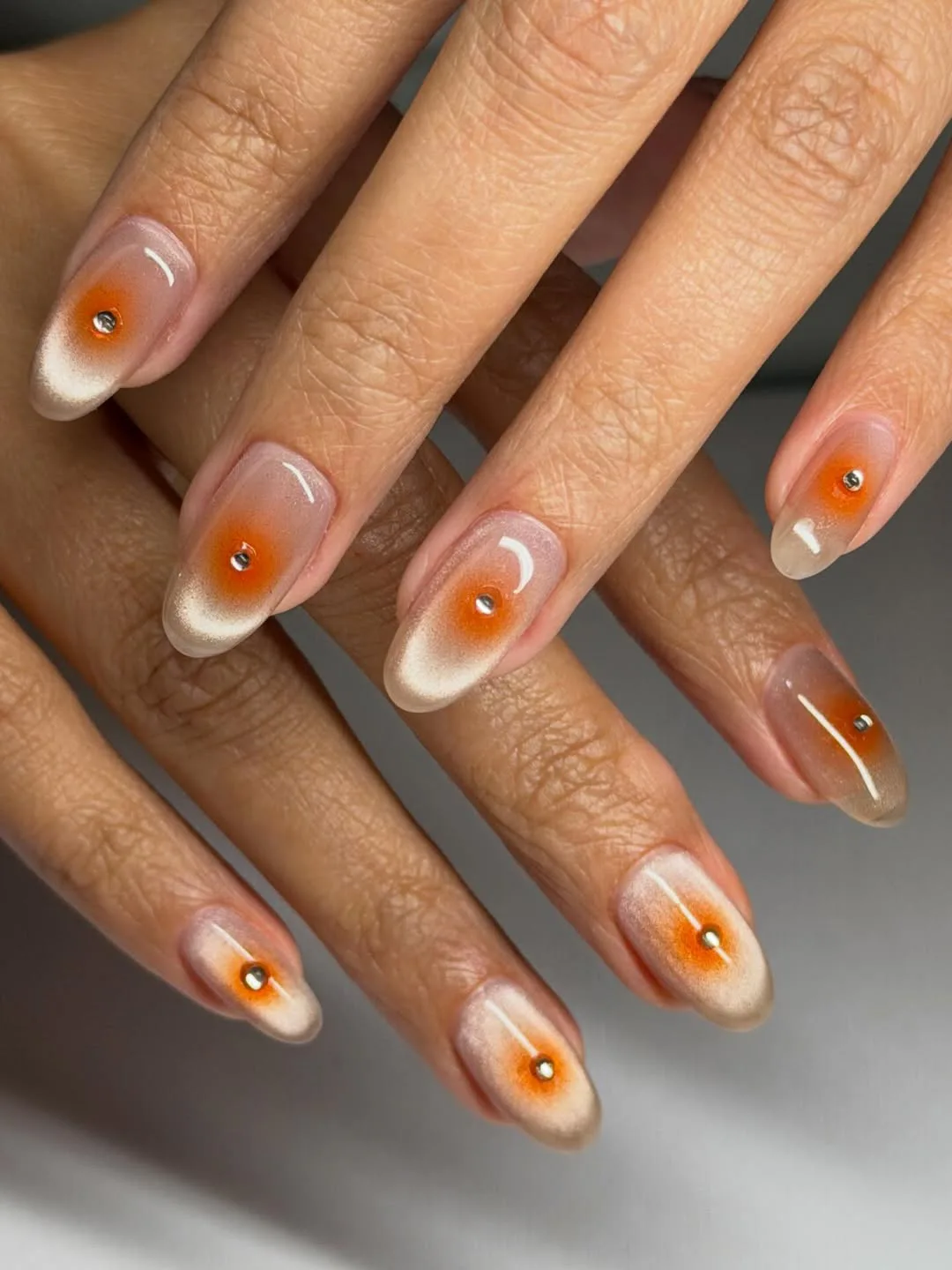 From cateye to chrome, this year’s nail art is all about textural finishes — and these raised, glass-like ridges slot right in. With a sheer orange base, it feels rich, dimensional, and a little unexpected.