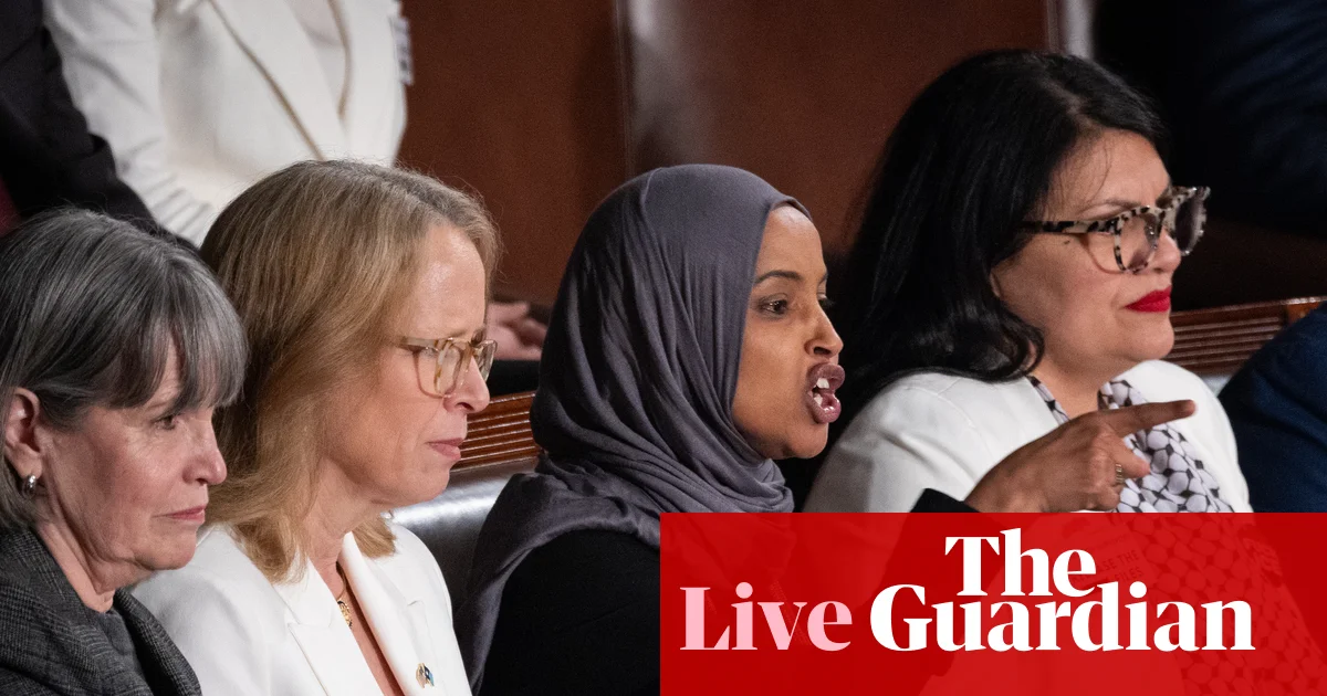 The House speaker, Mike Johnson, said he came “this close” to ejecting Democratic representatives Ilhan Omar and Rashida Tlaib from the chamber during last night’s state of the union over their verbal protests to Trump’s remarks.