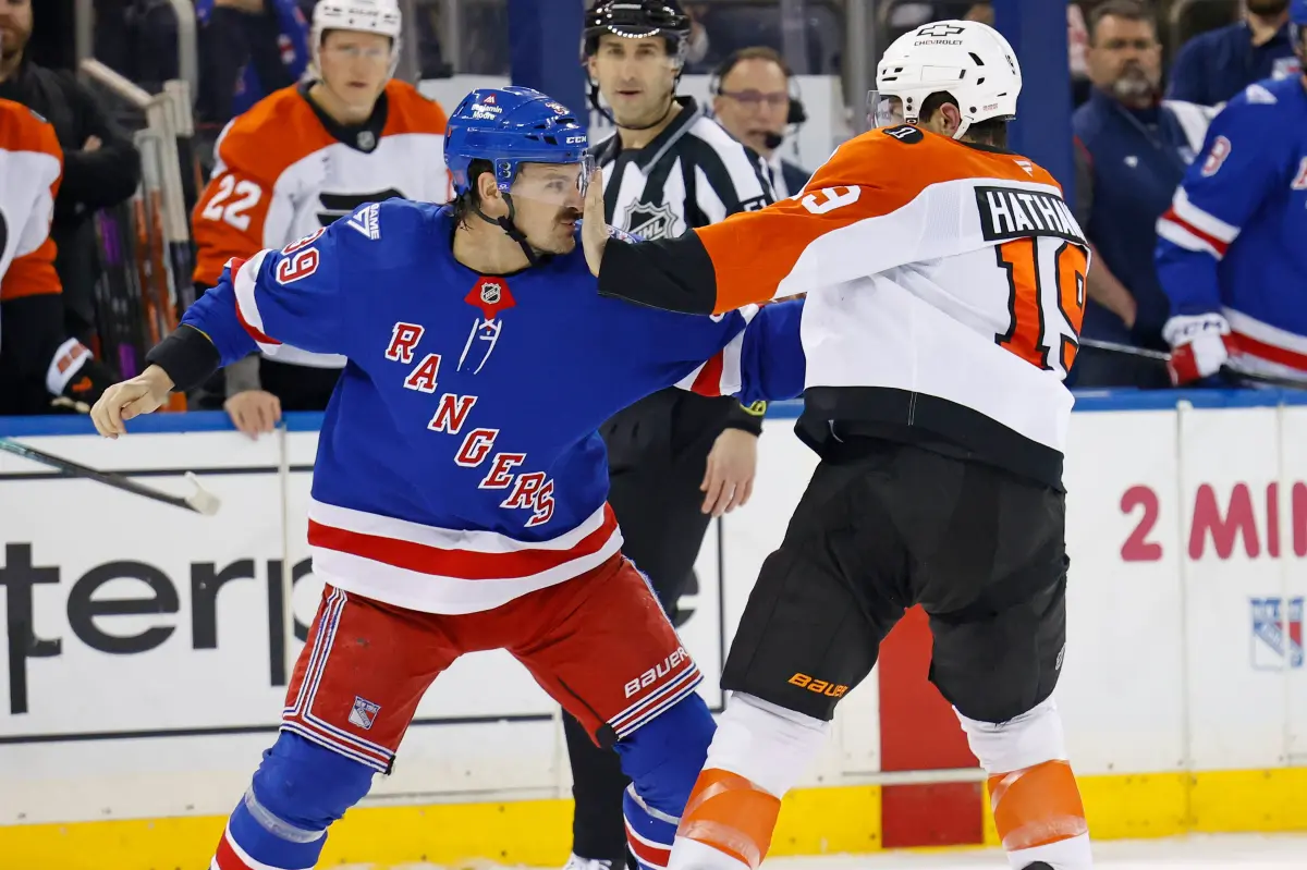 After the Flyers’ Garnet Hathaway drilled Brennan Othmann into the boards, Carrick was right on his tail immediately after.