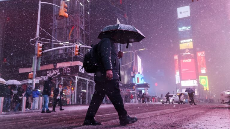 Pedestrians in the snow at Times Square during a winter storm in New York, US, on Sunday, Feb. 22, 2026.…