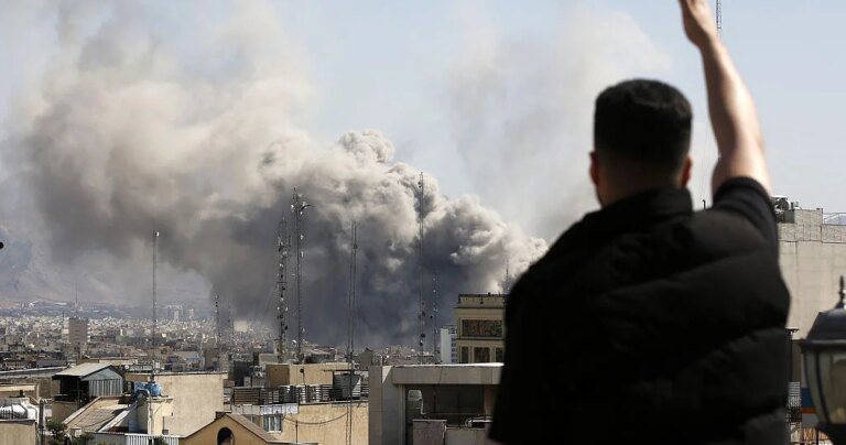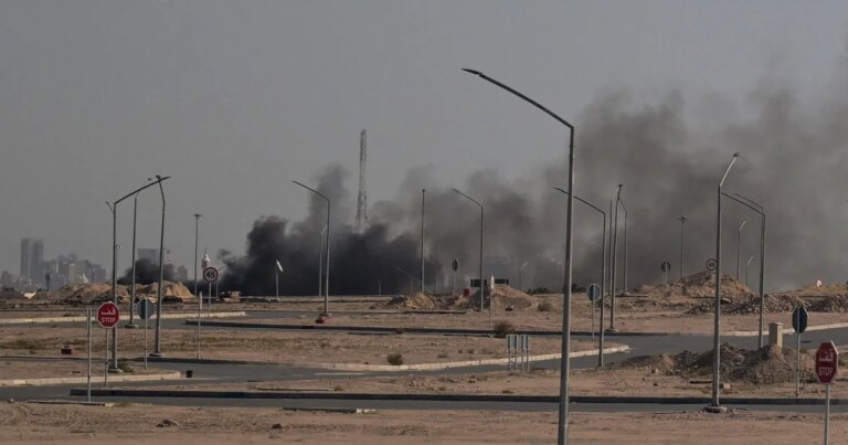 Smoke rises over Konarak naval base in southern Iran on Sunday. The base was one of hundreds of targets of…