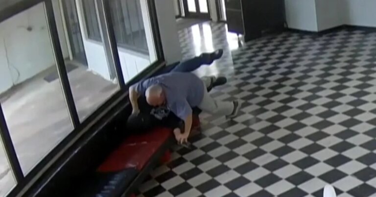 Video shared on Tuesday shows the moment an Oklahoma high school principal rushed and tackled an armed former student, preventing…